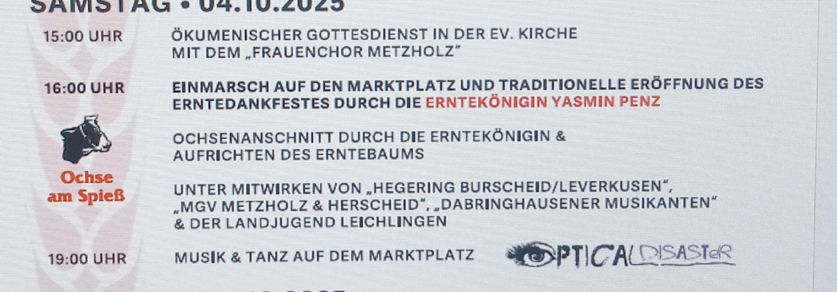 Am Samstag beginnt das Fest um 15 Uhr mit einem ökumenischen Gottesdienst in der evangelischen Kirche, dem Alten vom Berge, unterstützt vom Frauenchor Metzholz 1993.
