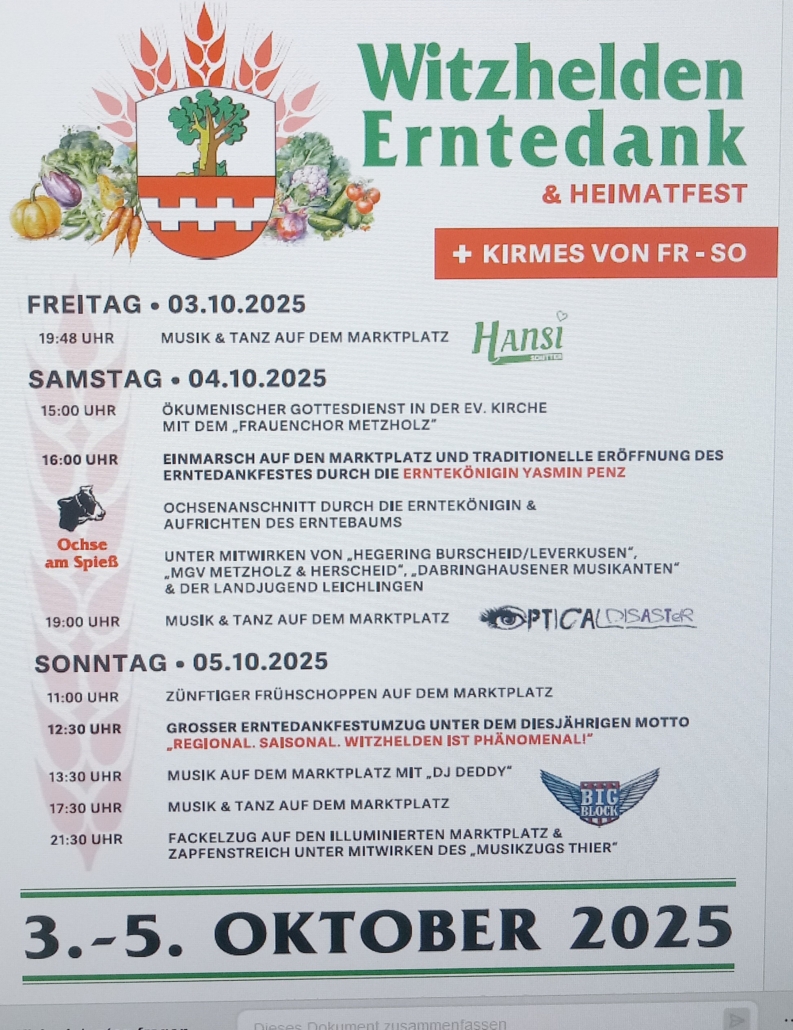 Programm zum 76. Erntedank- und Heimatfest in Witzhelden